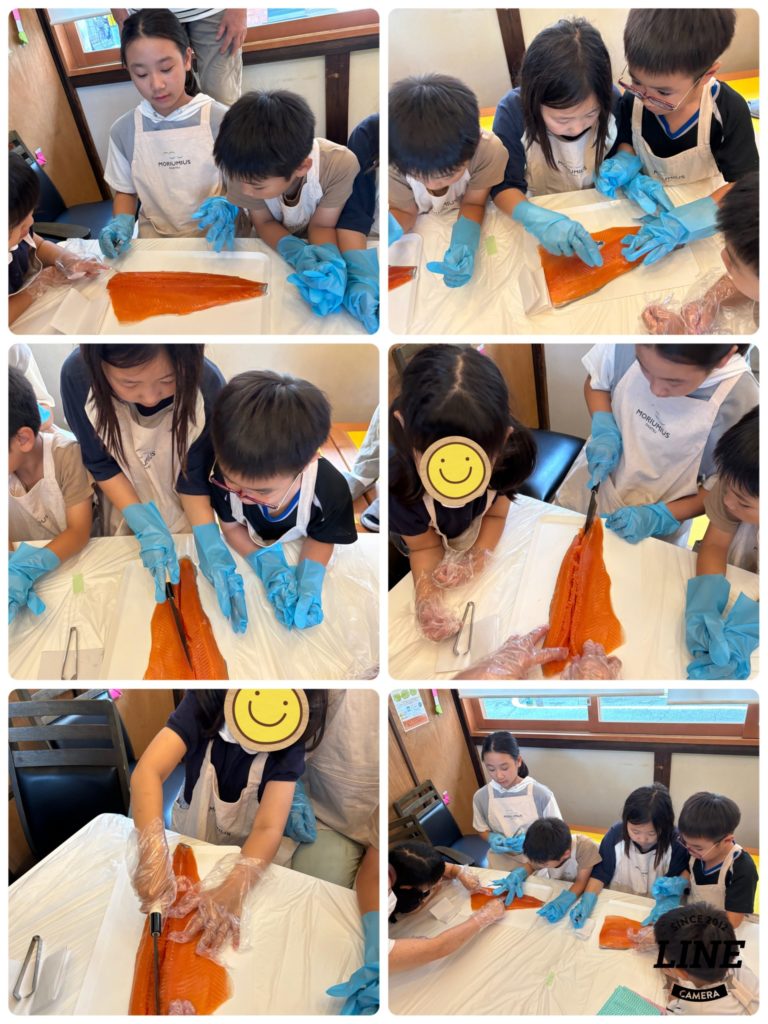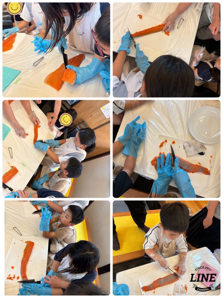 銀鮭の調理では、指先でそっと鮭の身に触れ骨が当たる感覚を味わったり、皮を引く体験もし皮が硬ーい!と驚くキッズも