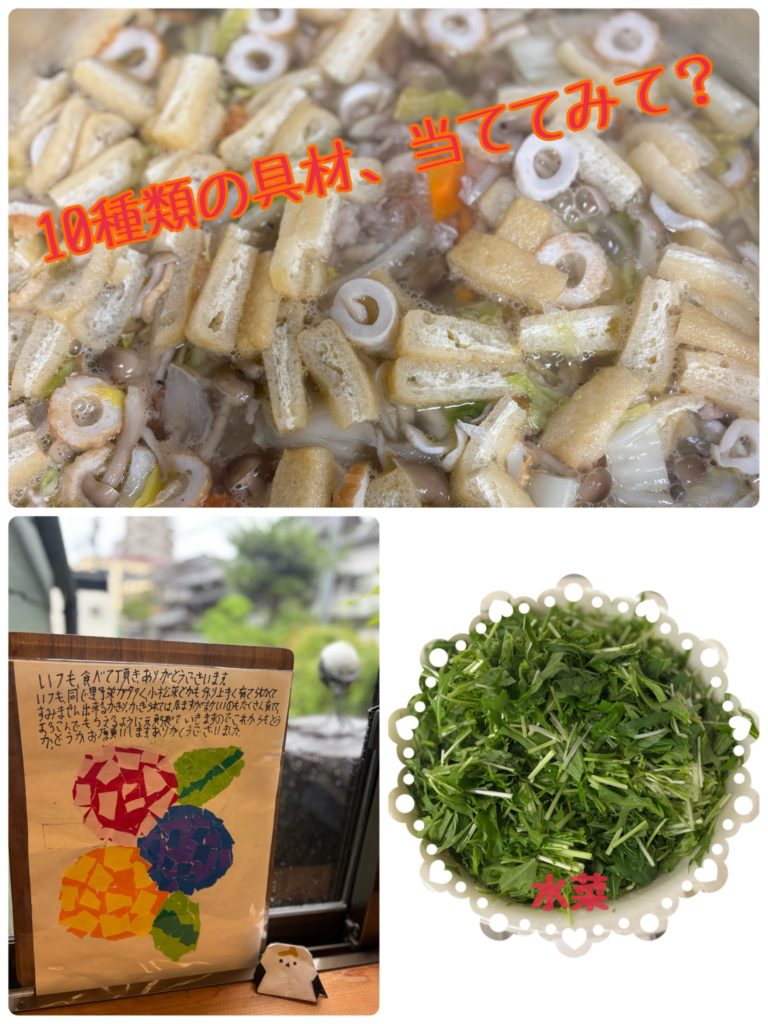 因みに正解は、ネギ、玉ねぎ、大根、白菜、人参、じゃがいも、豚肉、ちくわ、うすあげ、しめじの10種類でした。