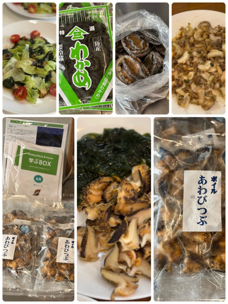 8月に送られてきた食材は、アワビとつぶ貝とわかめ。