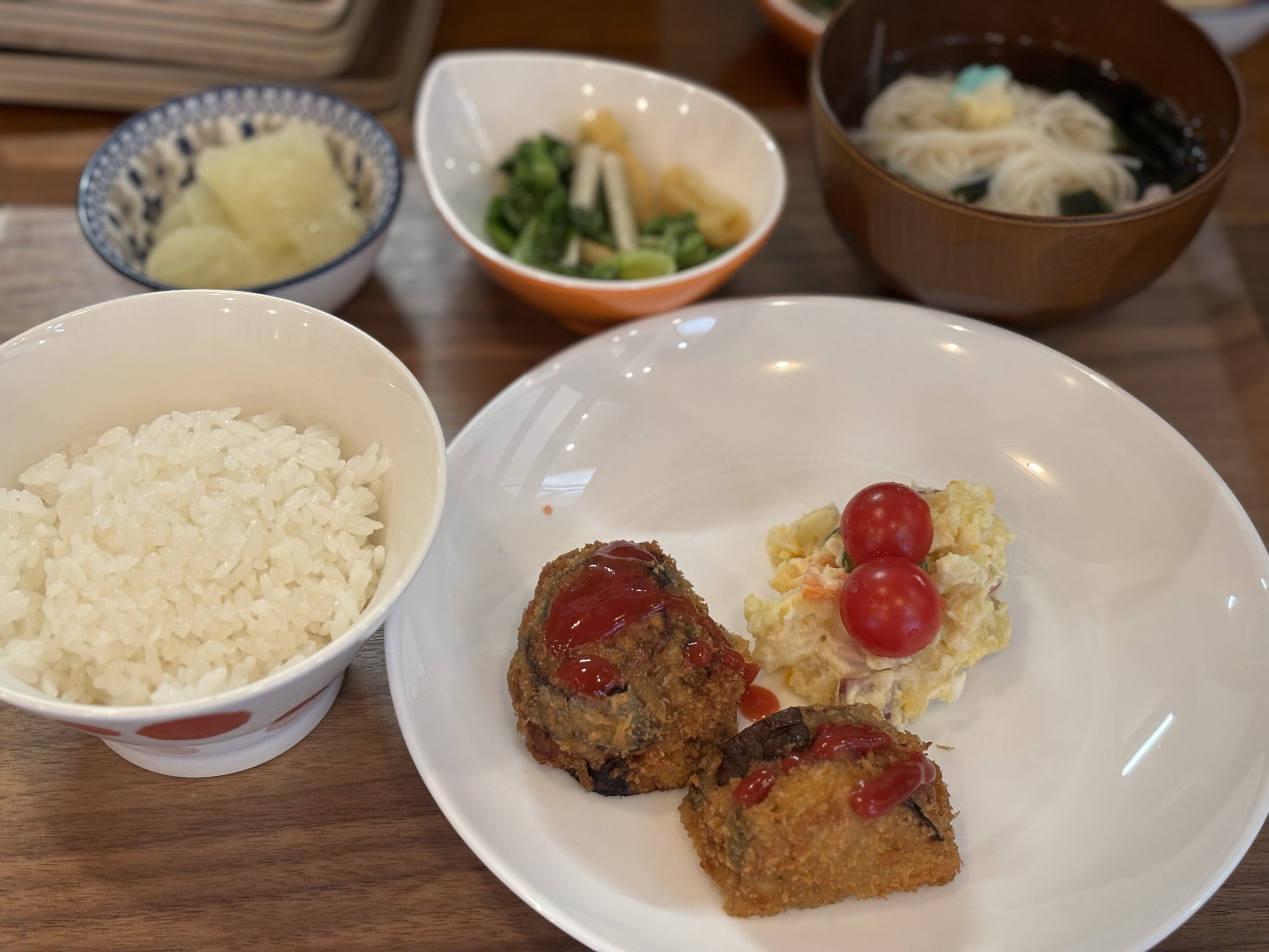 そんな今日の朝ごはんは、よつばホームデリバリーさんから頂いたなす🍆を使ってひき肉のはさみ揚げを作りました🍳